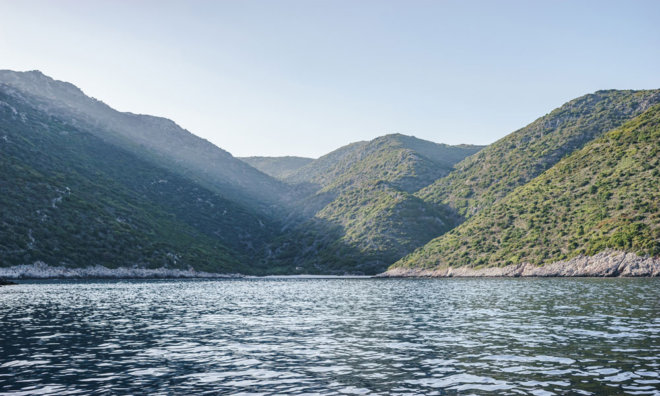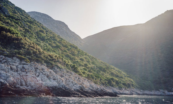Βγαίνοντας από το λιμάνι και σε απόσταση 20 λεπτών βρίσκεται ο Αντρόγιαλος. Η παραλία ξεχωρίζει για τα απότομα βράχια που την περιβάλλουν αλλά και για την κατάλευκη αμμουδιά της με τα κρυστάλλινα γαλαζοπράσινα νερά της. Συνήθως τα νερά της είναι πάντα ζεστά, σε κάποια σημεία όμως είναι δροσερά μαρτυρώντας προφανώς την ύπαρξη υπόγειων τρεχούμενων νερών.